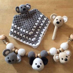 Sættet består af Barnevognskæde, Raslebamse og sutteklud med bamsehoved.