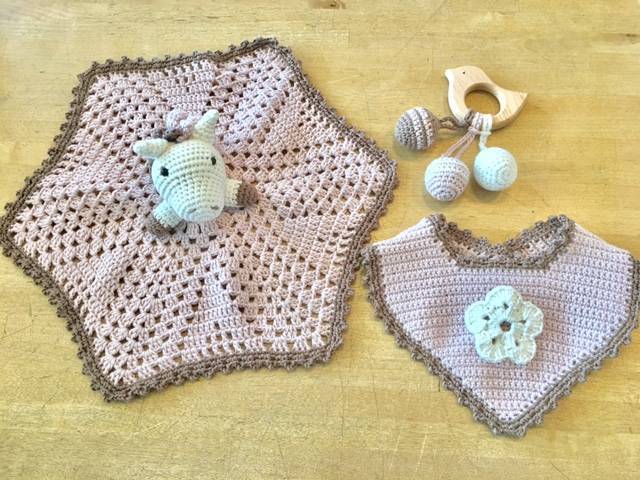 Opskrift til barselssæt med en lille hest hagesmæk med blomst og rangle