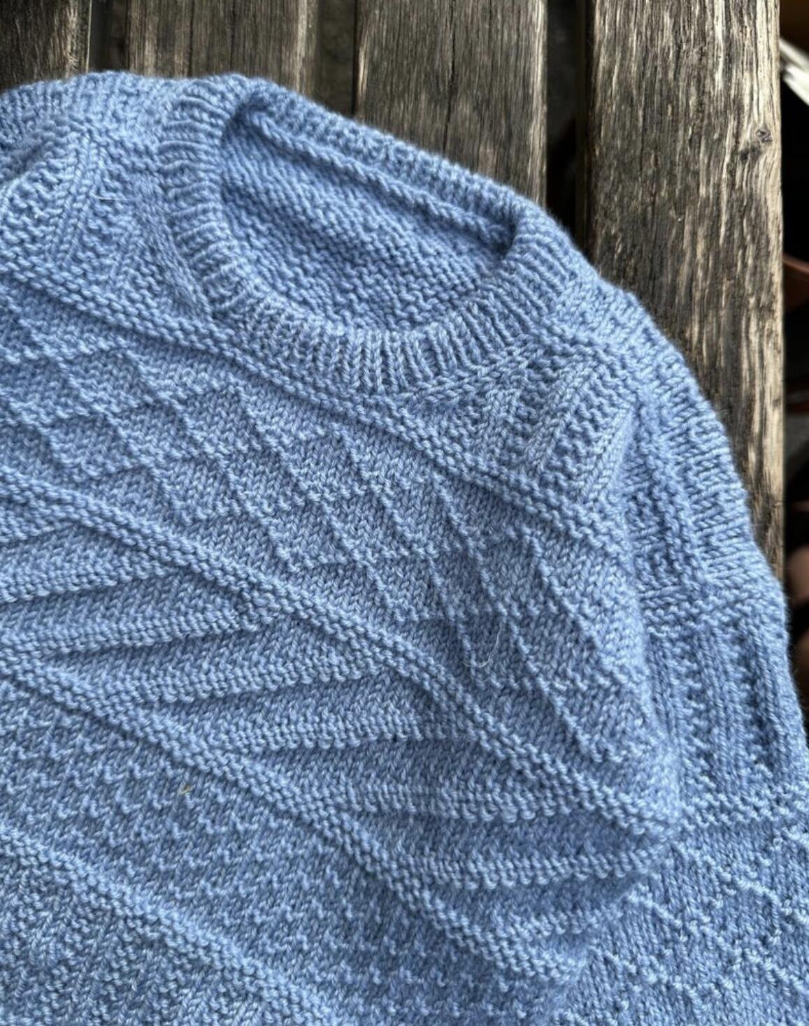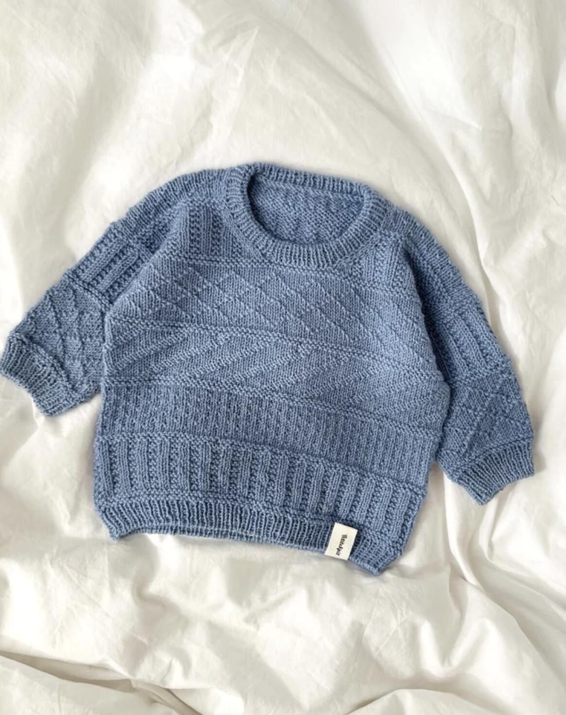 Den blå Storm Sweater Baby er strikket i Sunday fra Sandnes Garn i farven Baby blue eyes [6043].