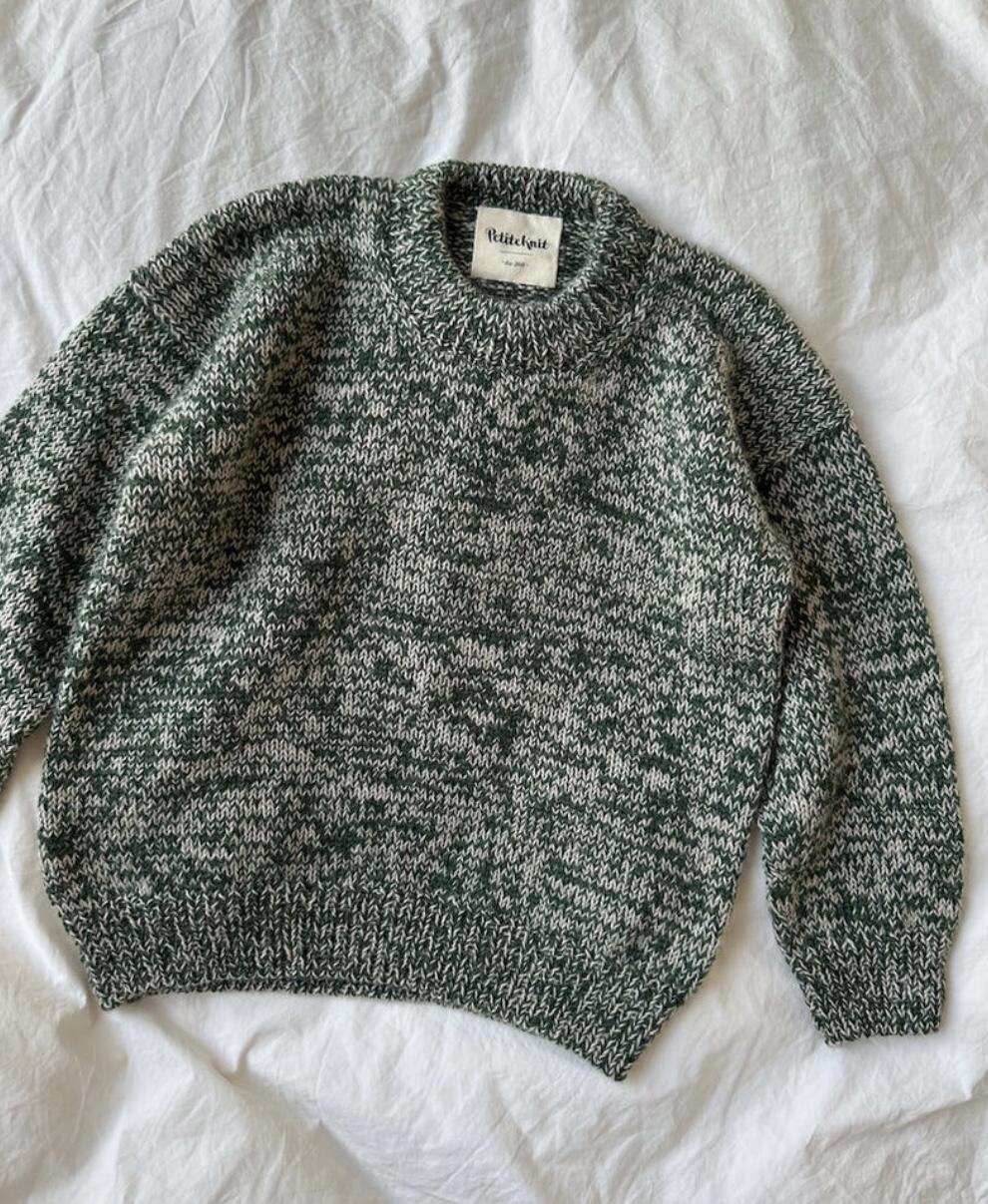 Den grønne og hvide Melange Sweater Junior er strikket i Tynn Peer Gynt fra Sandnes Garn i farverne Skovgrøn [8082] og Naturmelert [2641].
