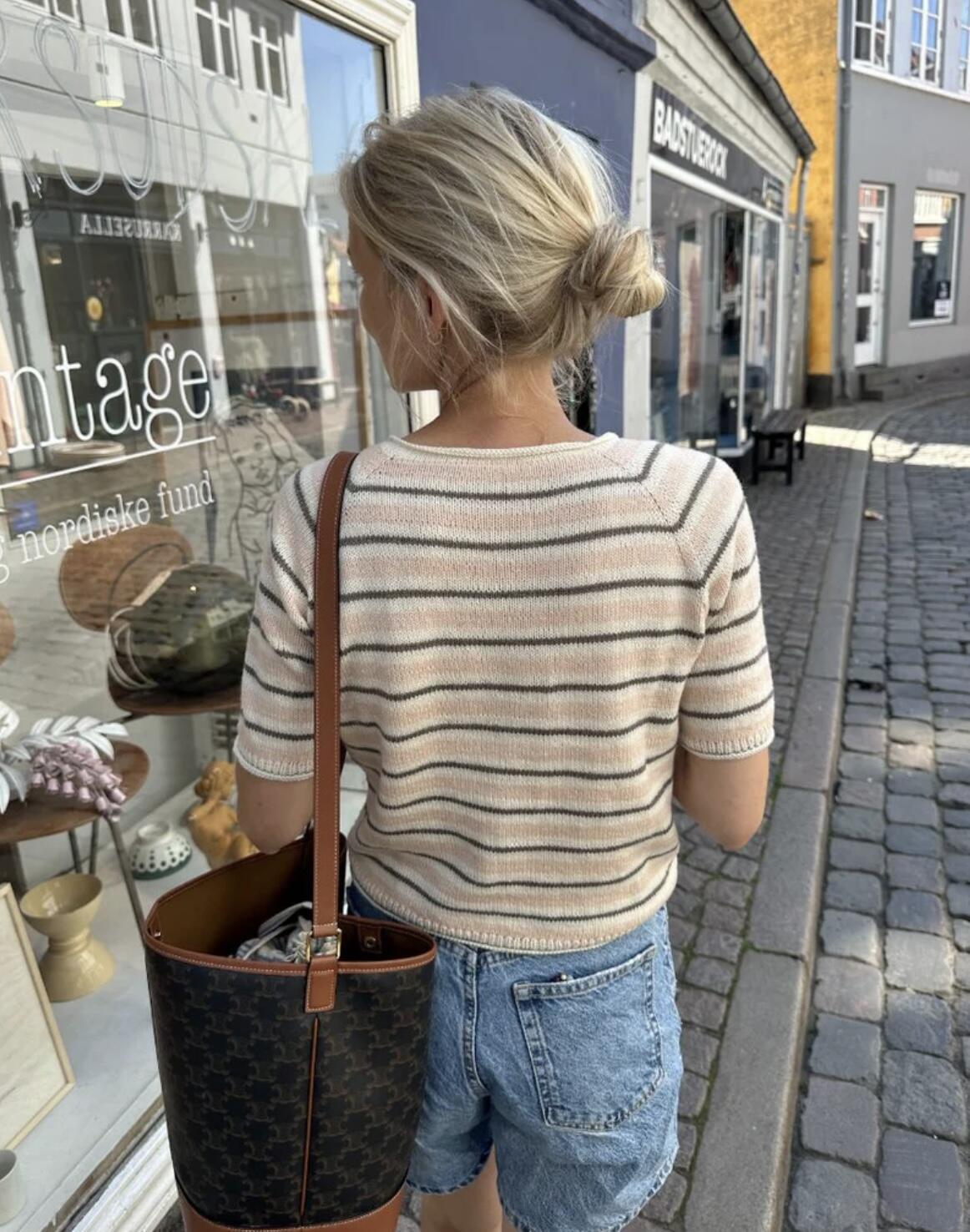 Den ferskenfarvede Amélie Tee er strikket i Merci fra Filcolana i farverne Light peach [1130], Marshland [612] og Natural white [101].