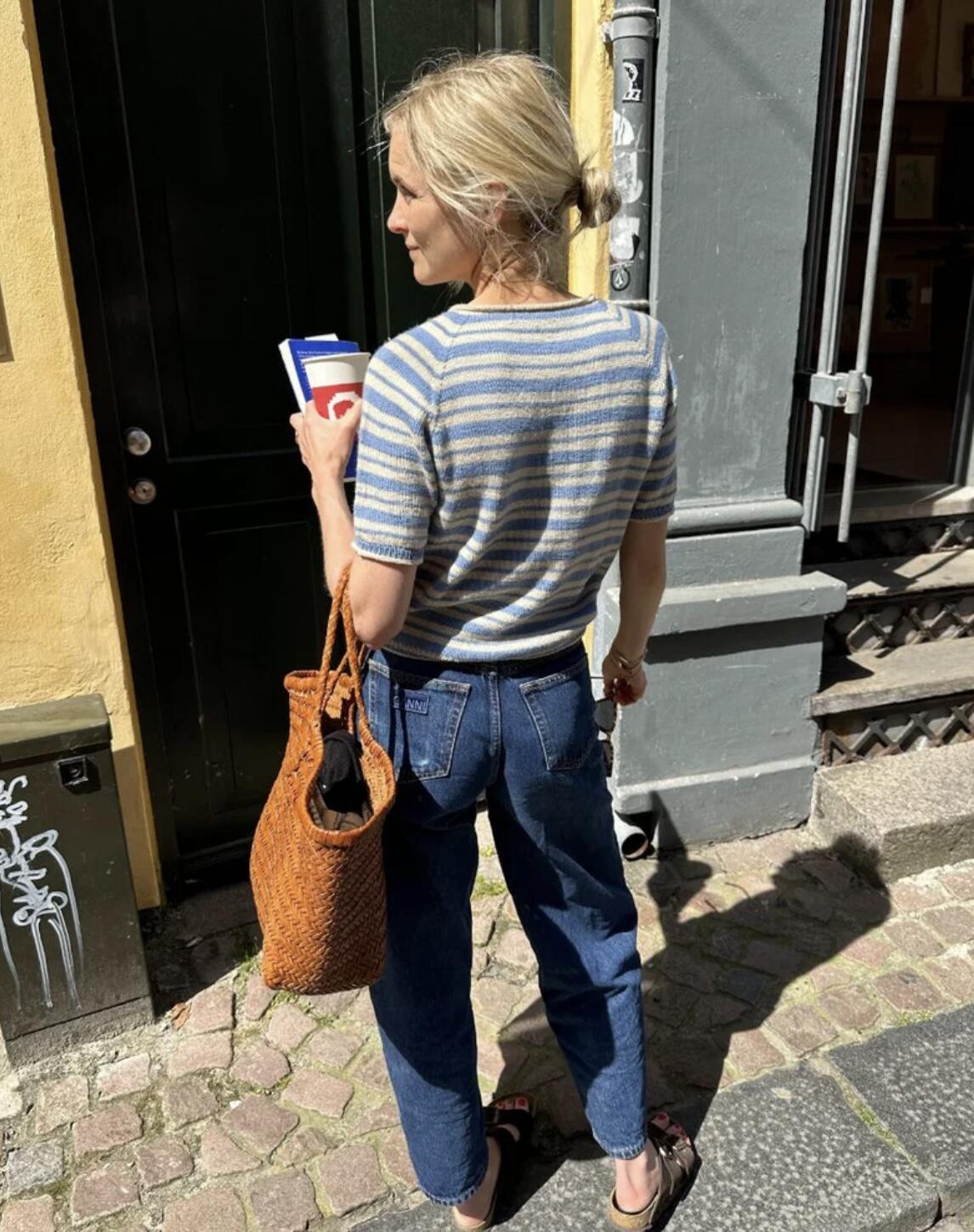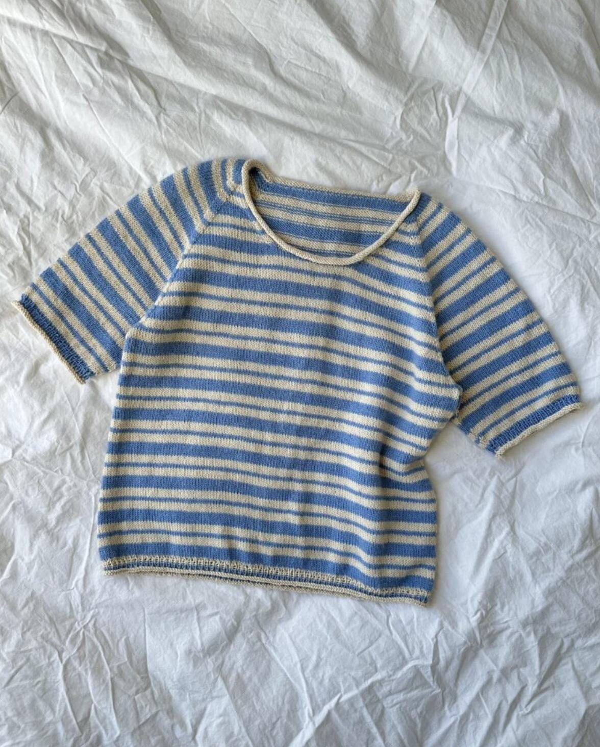 Den hvide og blå Amélie Tee er strikket i Sunday fra Sandnes Garn i farverne Almond [2511] og Baby blue eyes [6043].