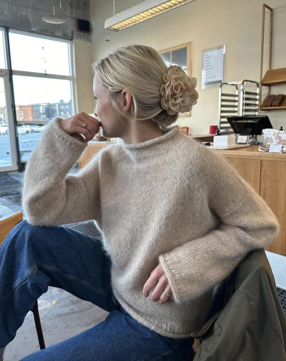 Den beige Cloud Sweater er strikket i Eco Soft fra Isager i farve E6S sammen med Silk Mohair fra Isager i farve 6.