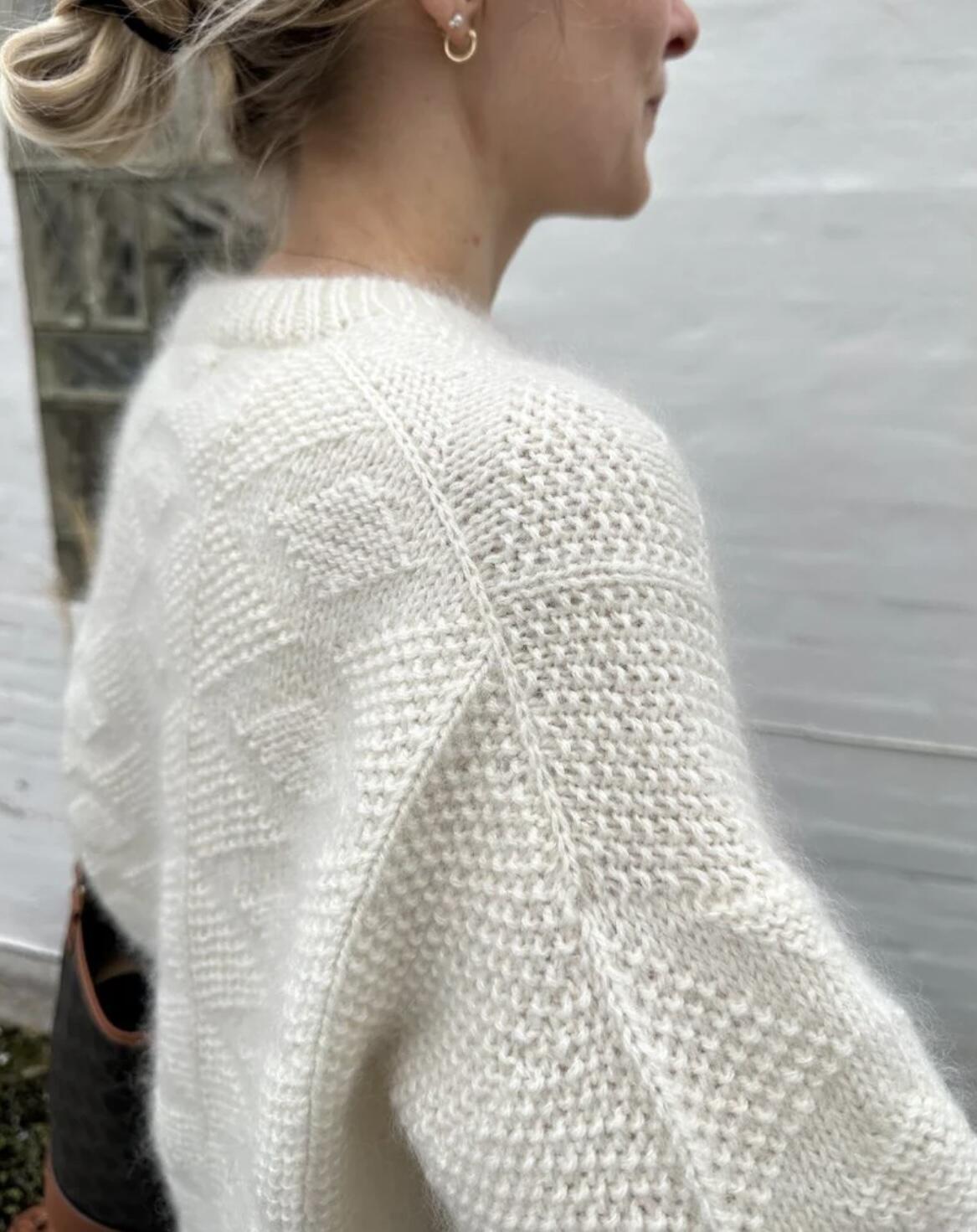 Den hvide Esther Sweater er strikket i Jensen Yarn fra Isager i farve 0 sammen med Silk Mohair fra Isager i farve E0.
