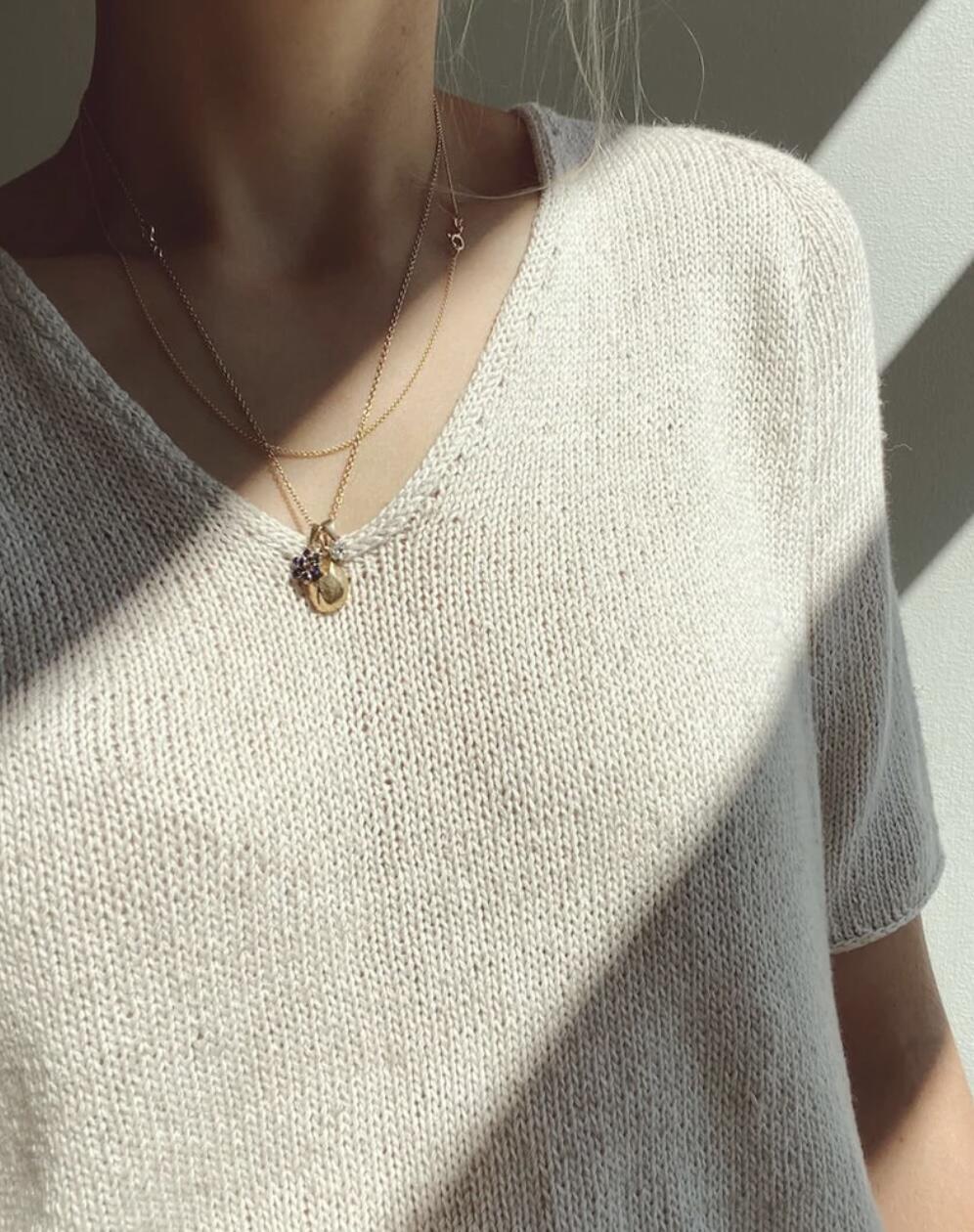 Kumulus Tee strikkes i glatstrik oppefra og ned og har en afrundet V-udskæring foran. Ærmerne går til albuerne, og langs alle kanter strikkes en i-cordkant. Kumulus Tee er monteringsfri.
