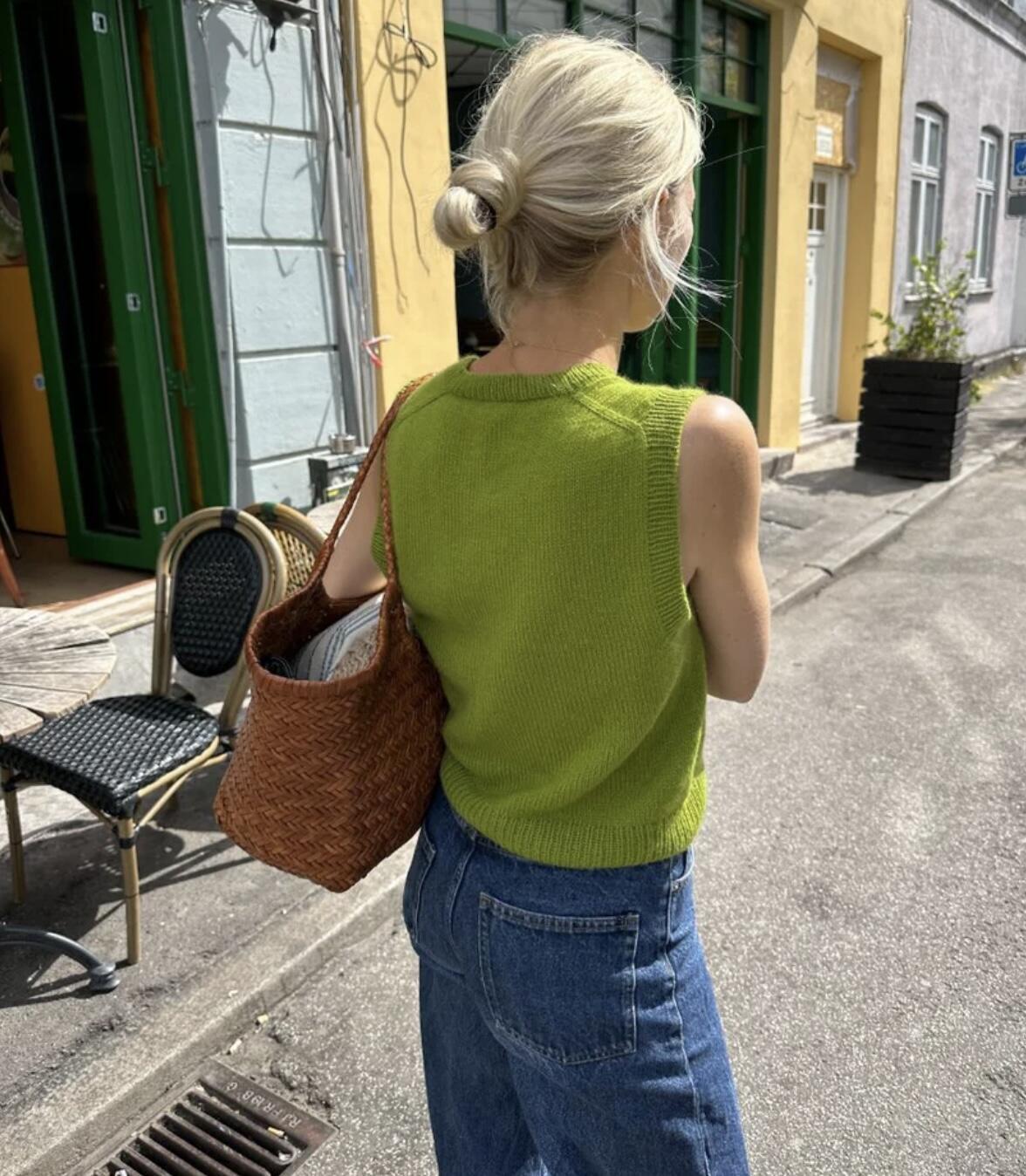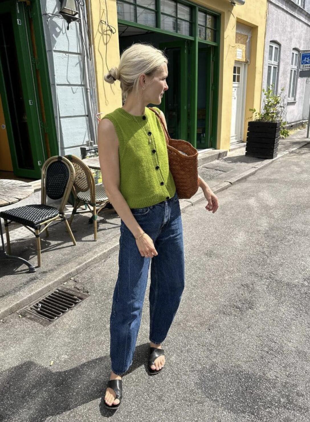 Den grønne Maggie Vest er strikket i Cashmere Classic fra Cardiff i farven Niwa [725].