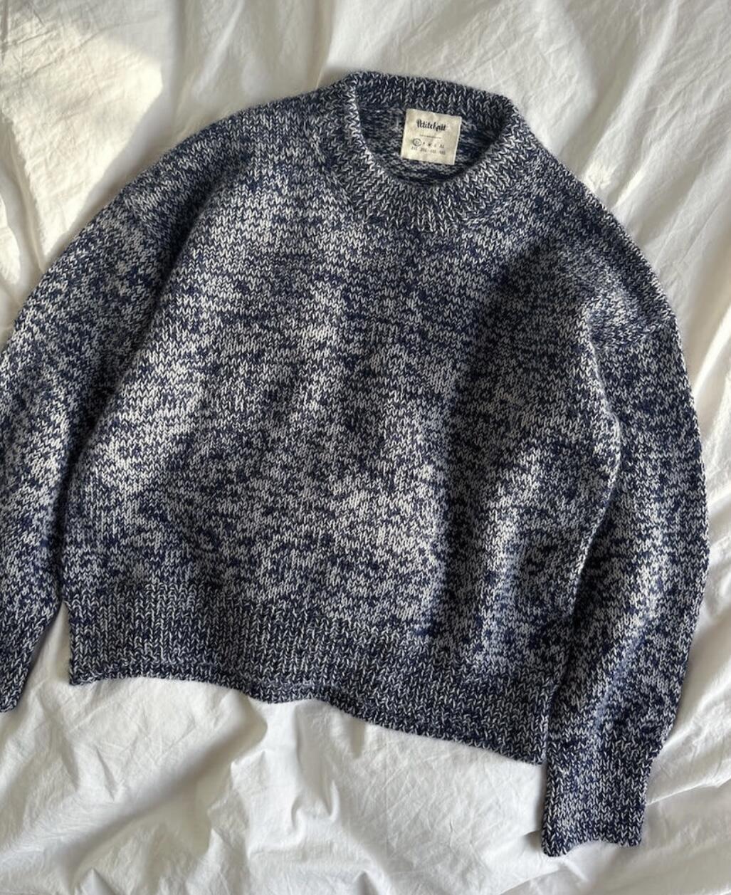 Den hvide og mørkeblå Melange Sweater er strikket i Tynn Peer Gynt fra Sandnes Garn i farverne Naturmelert [2641] og Marine [5575].