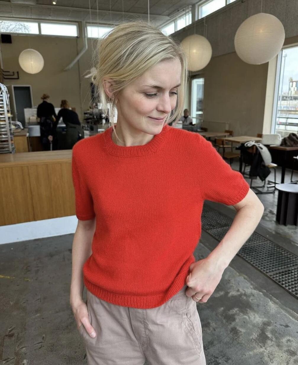 Den røde Poppy Tee er strikket i Cashmere Classic fra Cardiff i farven Hermes [517].