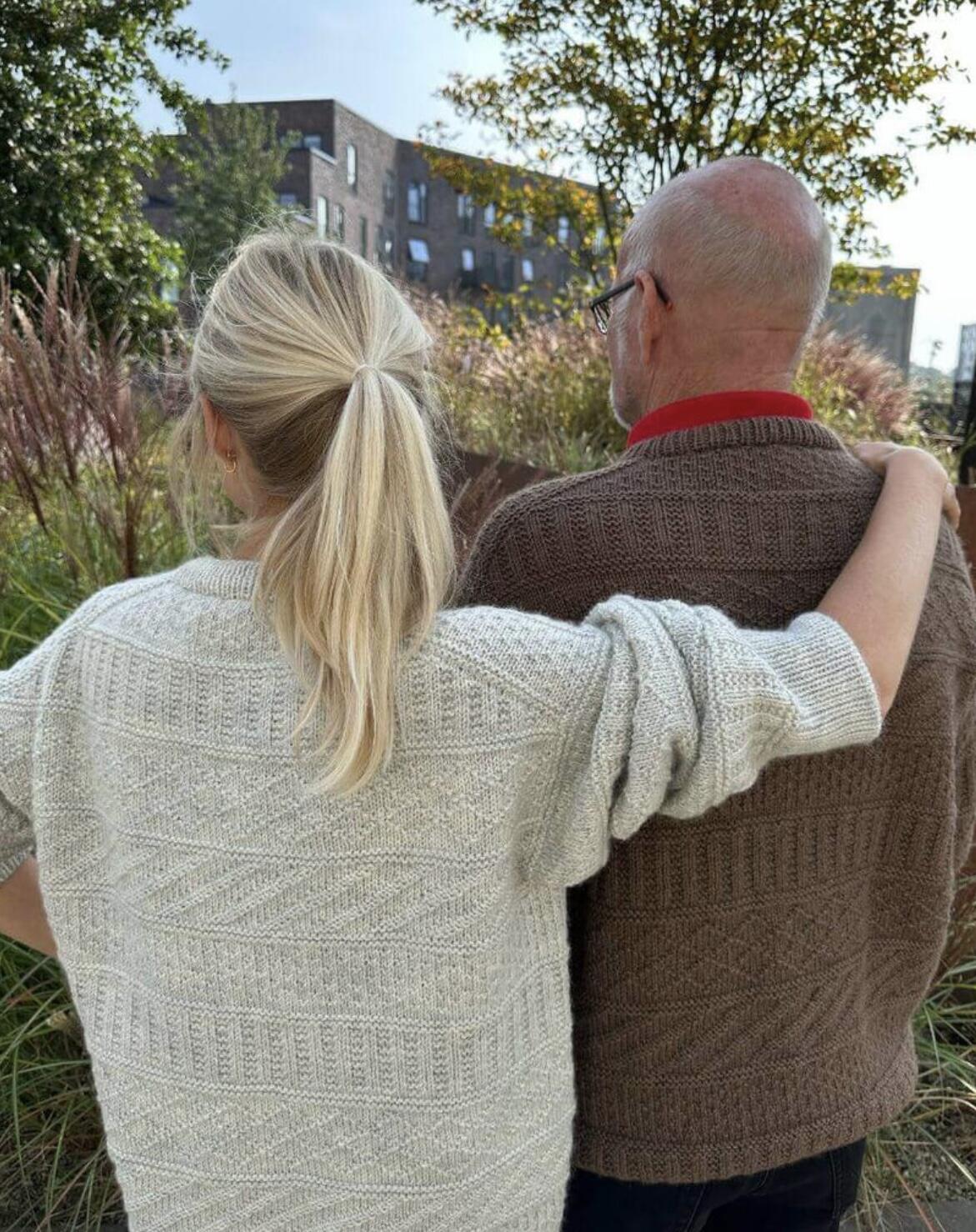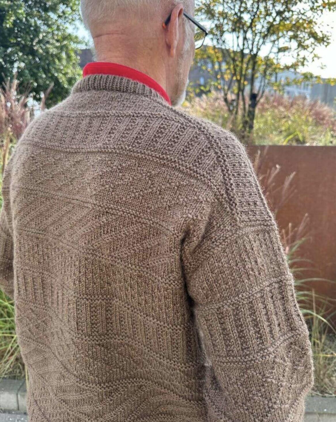 Den brune Storm Sweater Man er strikket i Peer Gynt fra Sandnes Garn i farven Muskat melange [3070].