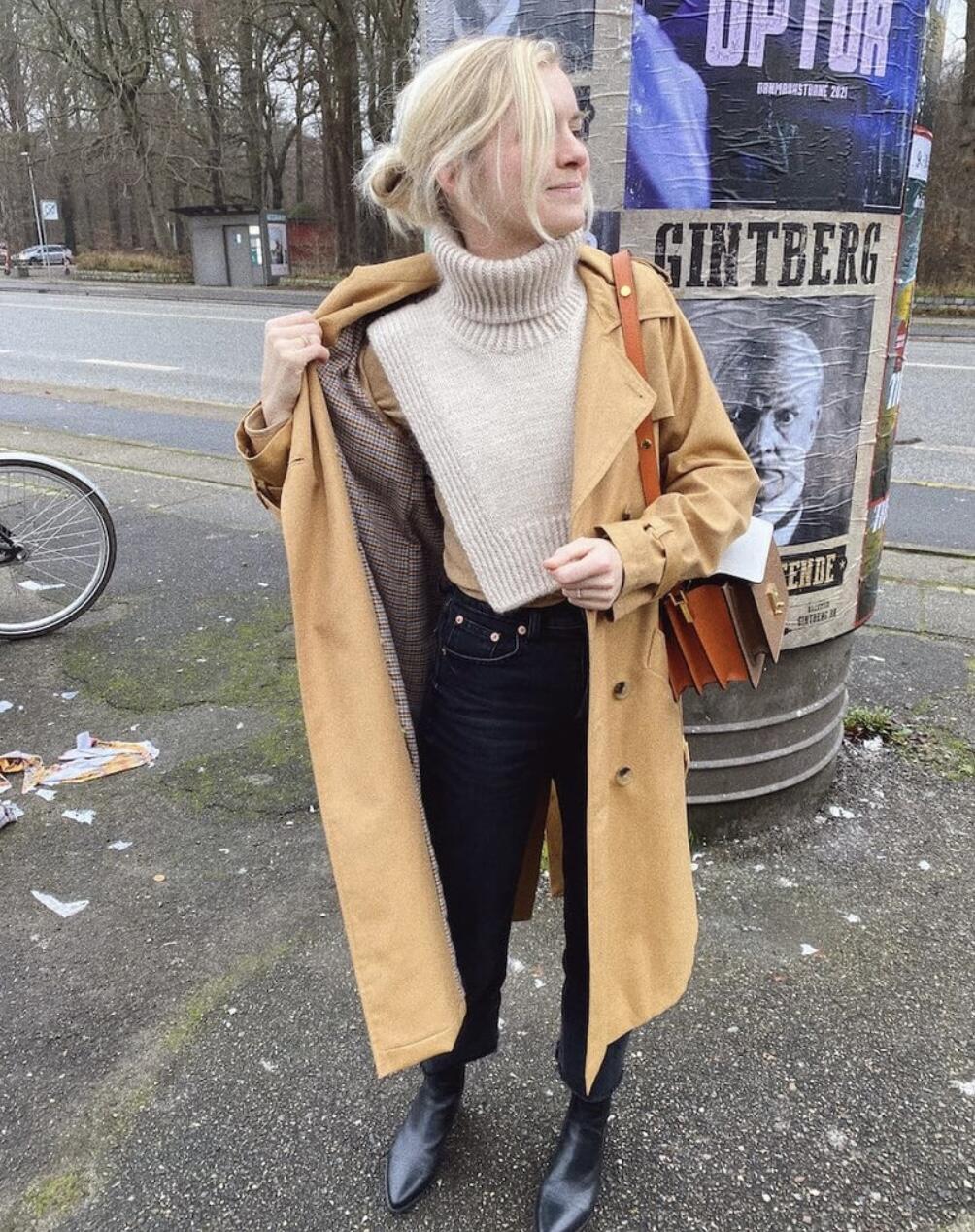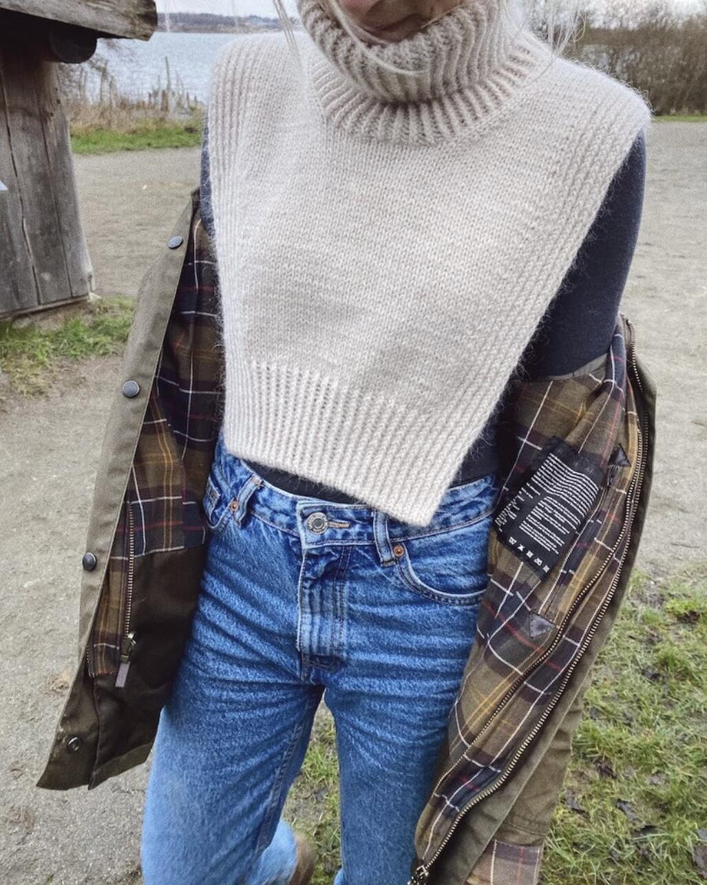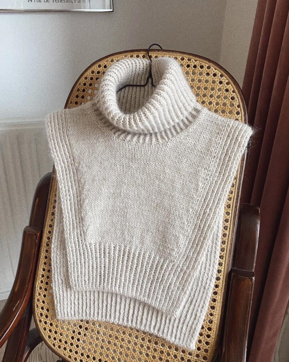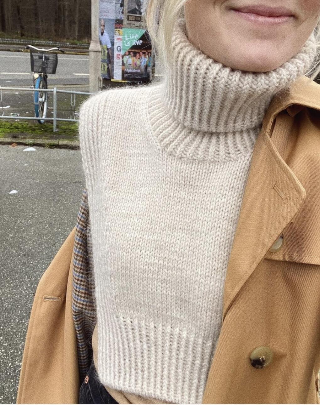 Terrazzo Neck strikkes fra rygstykket op mod skuldrene og ned over forstykket. Der strikkes en åbning til hovedet, hvor masker samles op til rullekraven. Terrazzo Neck er formet som firkant på ryggen og som et trapez fortil.